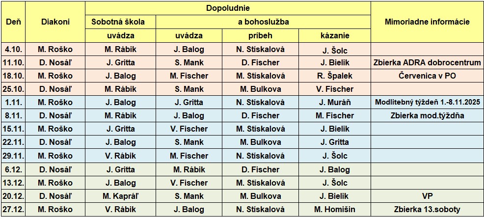 09:30 – 10:30 – Štúdium Biblie – Sobotná škola detí, mládeže, dospelých